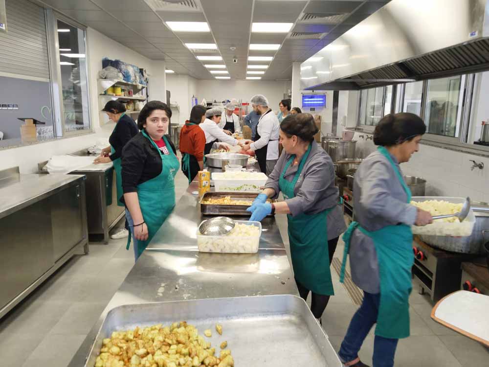 Mehr als 1.200 warme Mahlzeiten werden hier täglich frisch zubereitet und einerseits vor Ort an Hilfe Suchende ausgegeben sowie andererseits auch über lokale Pfarren an Bedürftige verteilt.